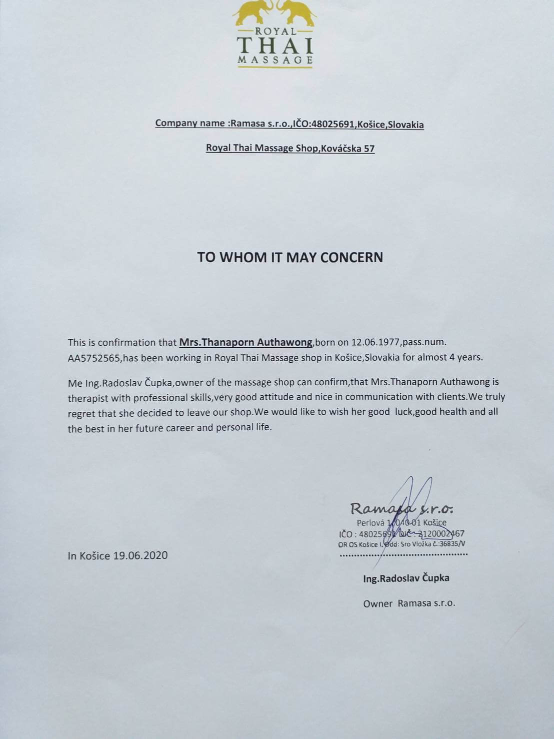 Thanaporn or Jane. She is 44 years old and still very healthy. She has about 8 years experience in this field. She is lovely and friendly. She has worked in Slovakia for almost 4 years but has to return back to Thailand due to COVID-19 situation. She is looking for another opportunity to work abroad again.
